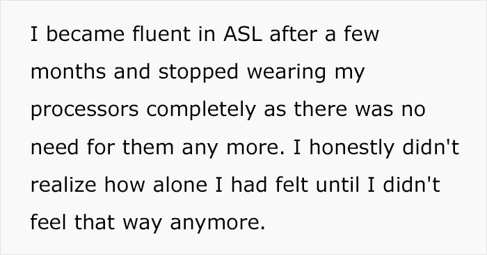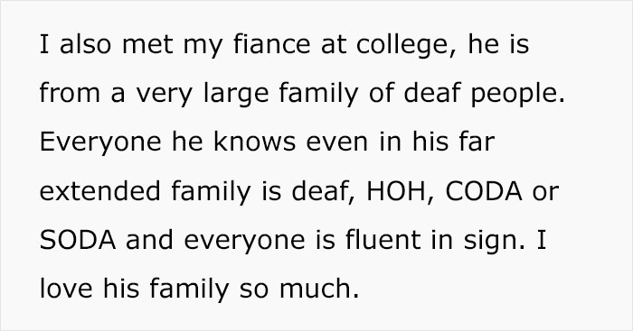 Despite her parents not wanting her to embrace her unavoidable condition, she still ended up learning ASL and got accepted into a deaf university, allowing her to feel more in her element. She even met her now husband there. And it turned out he’s from a very large family of deaf people, who OP loves dearly.