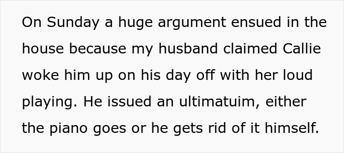 Everyone in the family is happy for Callie and admires her talent except for her stepdad. He thinks the piano is distracting and the teenager should focus more on school and building a foundation for her future, although, he never had an issue with Callie playing the piano before he and the OP started living together.