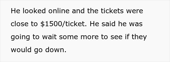 But as the date approached and he still hadn’t purchased them, she decided she wasn’t going to miss out on the trip